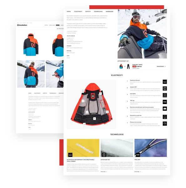 Milovníci adrenalinových sportů postavili svůj byznys především na kvalitním a designovém oblečení, které reflektuje potřeby snowboardistů. Různých vychytávek má oblečení opravdu hodně od praktických kapsiček až po technologii vlákna a střih. Jak vyzdvihnout to důležité a zároveň udržet přehlednou a rychlou administraci? Vytvořili jsme mapu produktu a přidali řazení šablon na detailu produktu podle potřeby. Svou velkou roli v prezentaci produktu hraje také grafika založená na kontrastech.